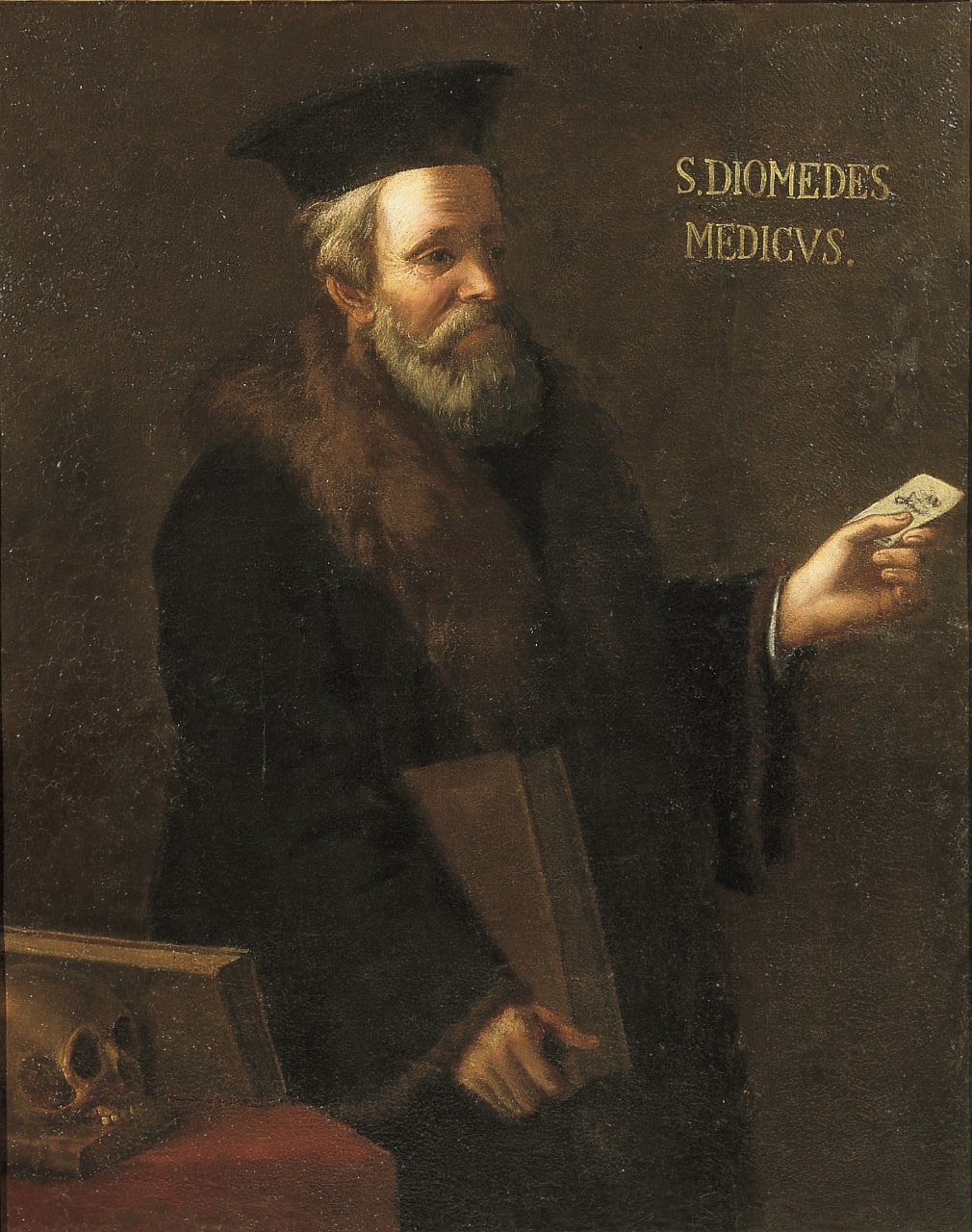 Originariamente pendant di una tela raffigurante Santa Caterina oggi perduta, il dipinto potrebbe essere ritenuto commissione del Luogo pio di Santa Caterina presso San Nazaro in Brolo in riferimento al benefattore Diomede Castano, devoto al culto del santo omonimo.