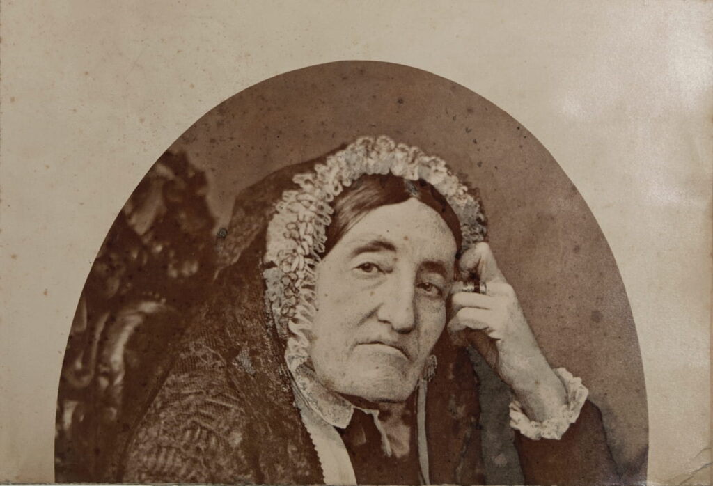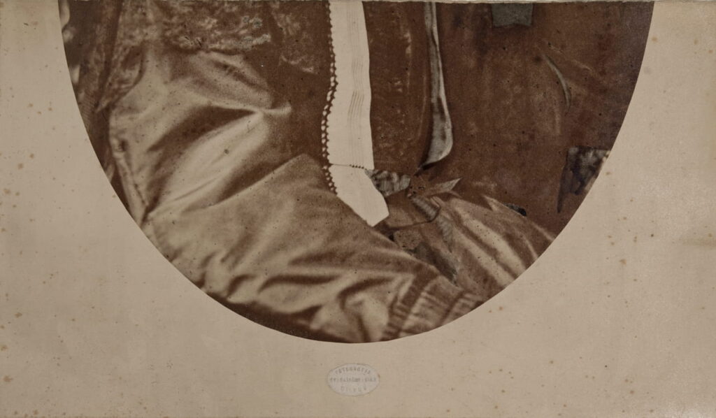 Recuperati e ricomposti quando possibile, queste effigi si presentano oggi quasi tutte prive della indicazione dell’identità dei personaggi raffigurati. Una delle eccezioni riguarda il ritratto di una importante benefattrice, Marina Germani, vedova del dottor Carlo Dell’Acqua, riconoscibile in quanto la quadreria dei benefattori possiede un suo ritratto a olio a tre quarti di figura all’evidenza ispirato da questa fotografia. L’immagine, verosimilmente un ingrandimento da una carte de visite, presenta una frattura orizzontale lungo la sua lunghezza ma è priva di perdite e quindi, se unita nelle sue due parti, combacia perfettamente restituendo la figura imponente e autorevole dell’anziana benefattrice nella sua interezza.
